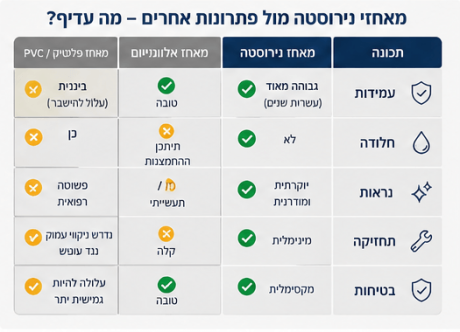תכונה | מאחז נירוסטה | מאחז פלסטיק / PVC | מאחז אלומיניום |